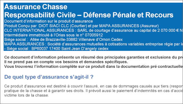 Nouveauté de cette année dans la demande de validation de chaque chasseur de Haute-Corse, la possibilité de souscrire un contrat d’assurance « Responsabilité Civile » permettant de prendre la formule d’assurance minimale exigée par la loi pour le prix de 20€ . Le chasseur souhaitant pouvoir prendre d’autres couvertures complémentaires (chien de chasse, société de chasse, armes, etc.) peut le faire ensuite séparément auprès du même assureur.